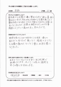すぐにはいい効果が現れませんが、こんなに最悪の症状と高齢の母でもここまで良くなったのは、先生の施術ですが、全く痛みもない施術なのになぜこのように良くなったのかまだ不思議です。