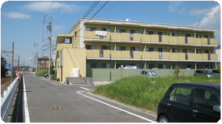 ②線路沿いの歩道をそのまま真っすぐ北へ行くと黄色と緑色の3階建物が見えてきます。